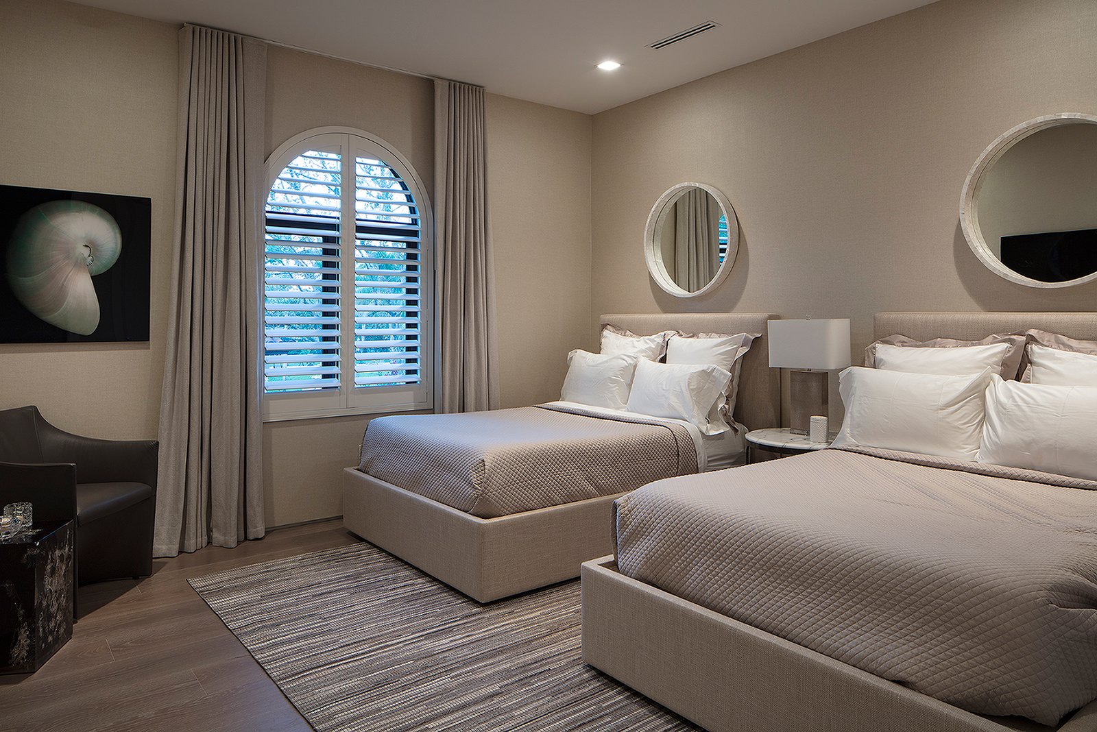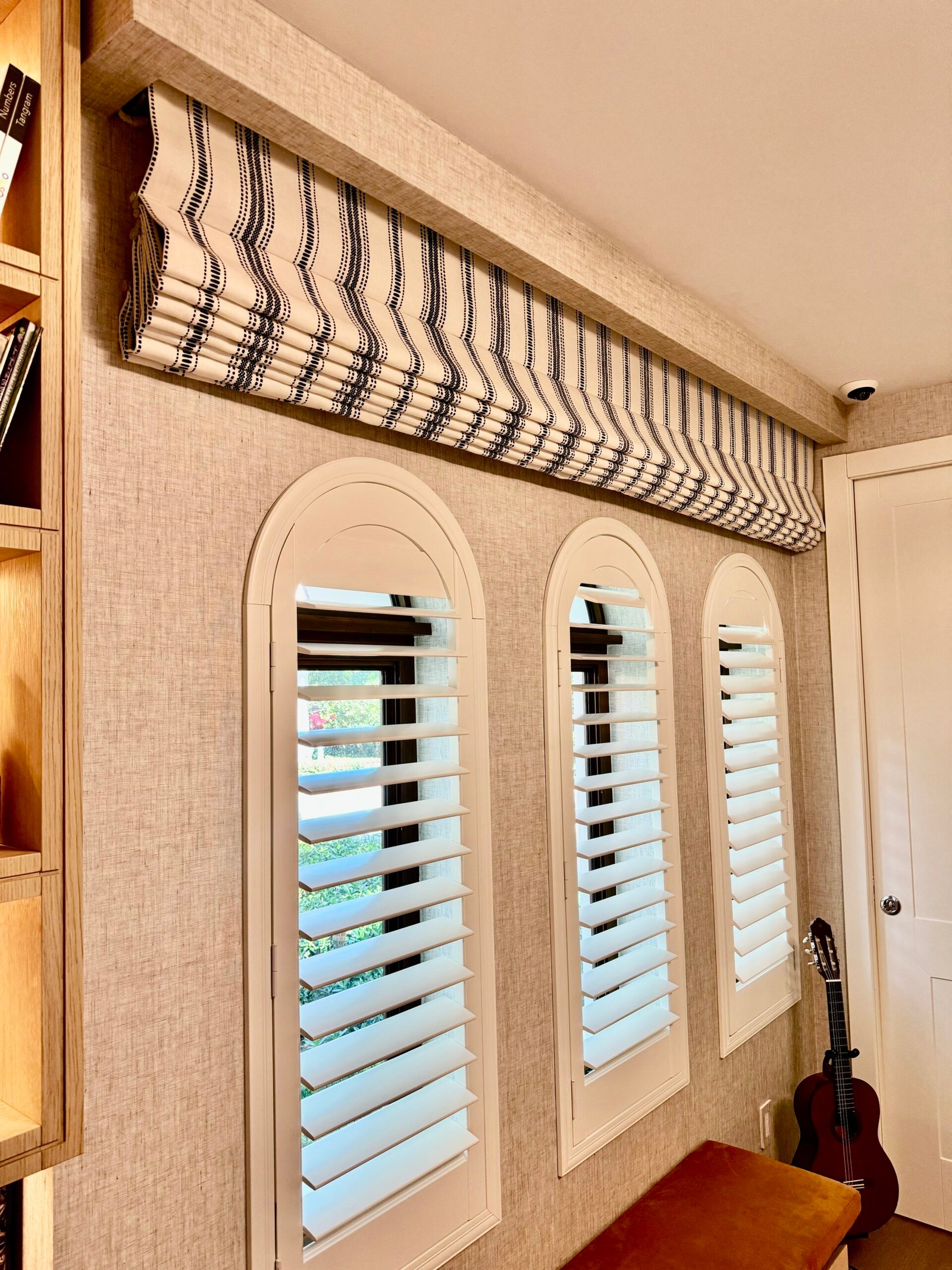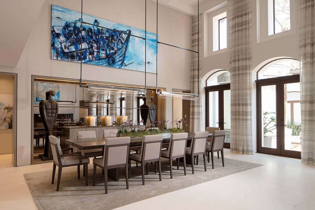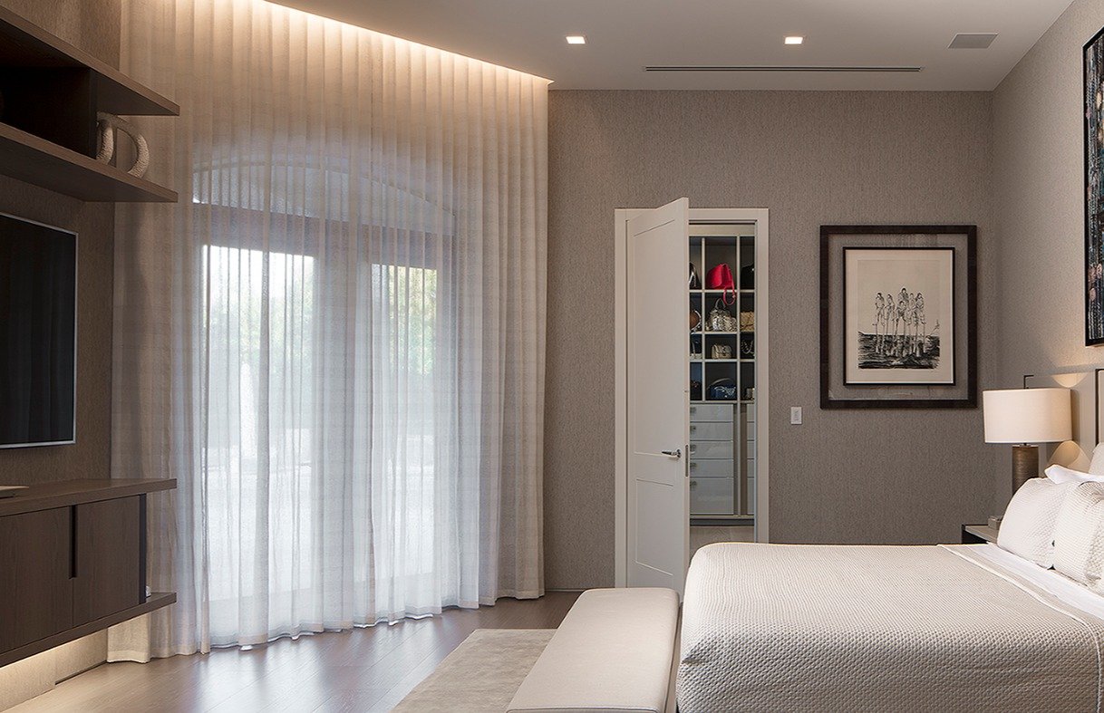 Villa Andurina is a modern Coral Gables residence defined by layered natural textures, custom window treatments, and tailored upholstery. Ripplefold linen sheers enhance double-height spaces with light and elegance, while premium wallcoverings and bespoke furnishings add warmth and depth. A neutral palette of greige and taupe unifies the design, creating a serene, timeless interior that reflects refined craftsmanship and luxury living