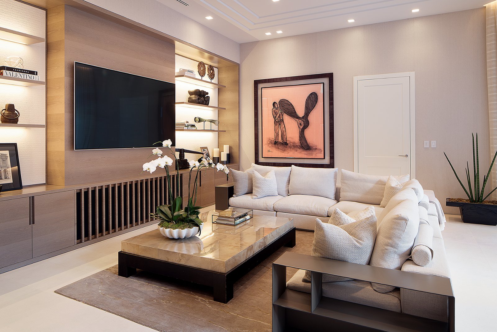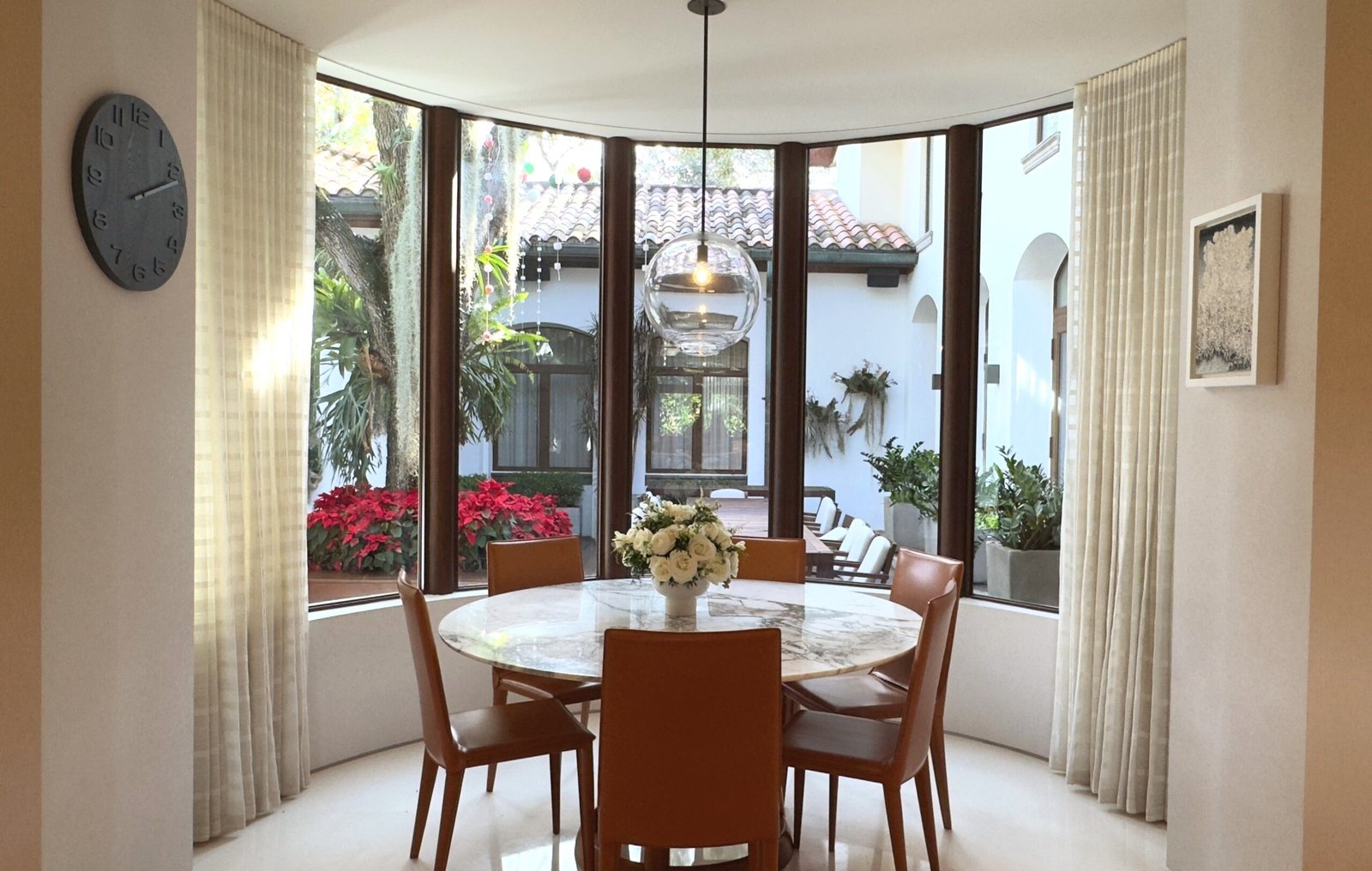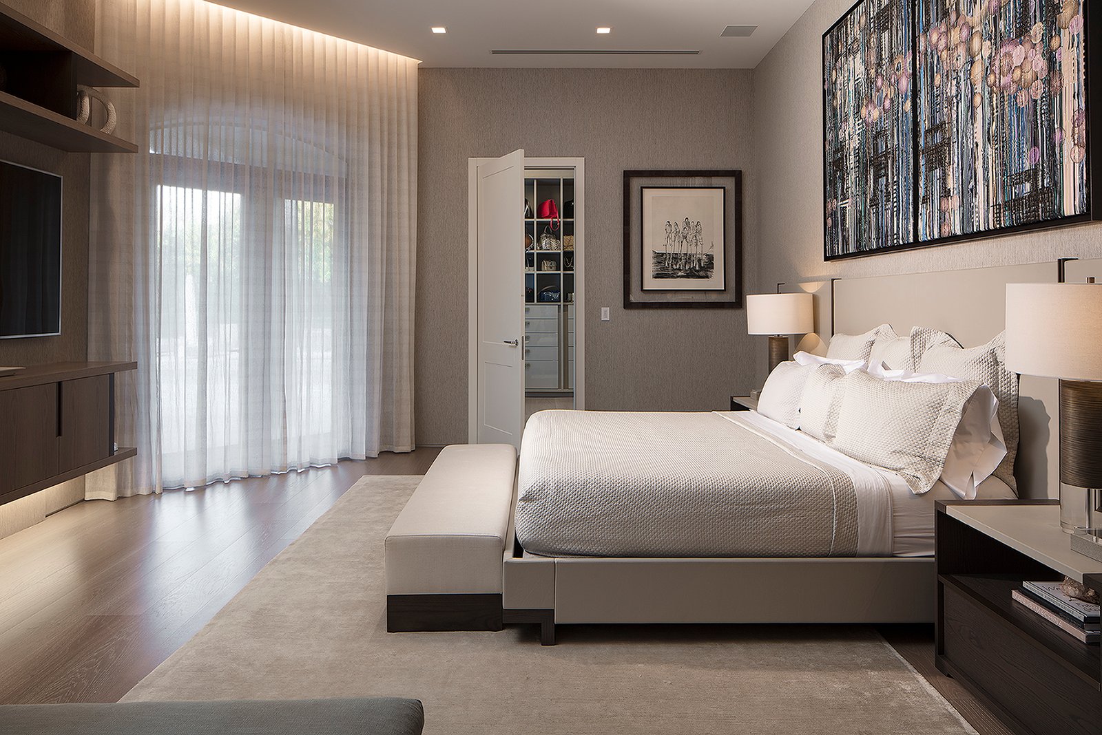 Villa Andurina is a modern Coral Gables residence defined by layered natural textures, custom window treatments, and tailored upholstery. Ripplefold linen sheers enhance double-height spaces with light and elegance, while premium wallcoverings and bespoke furnishings add warmth and depth. A neutral palette of greige and taupe unifies the design, creating a serene, timeless interior that reflects refined craftsmanship and luxury living