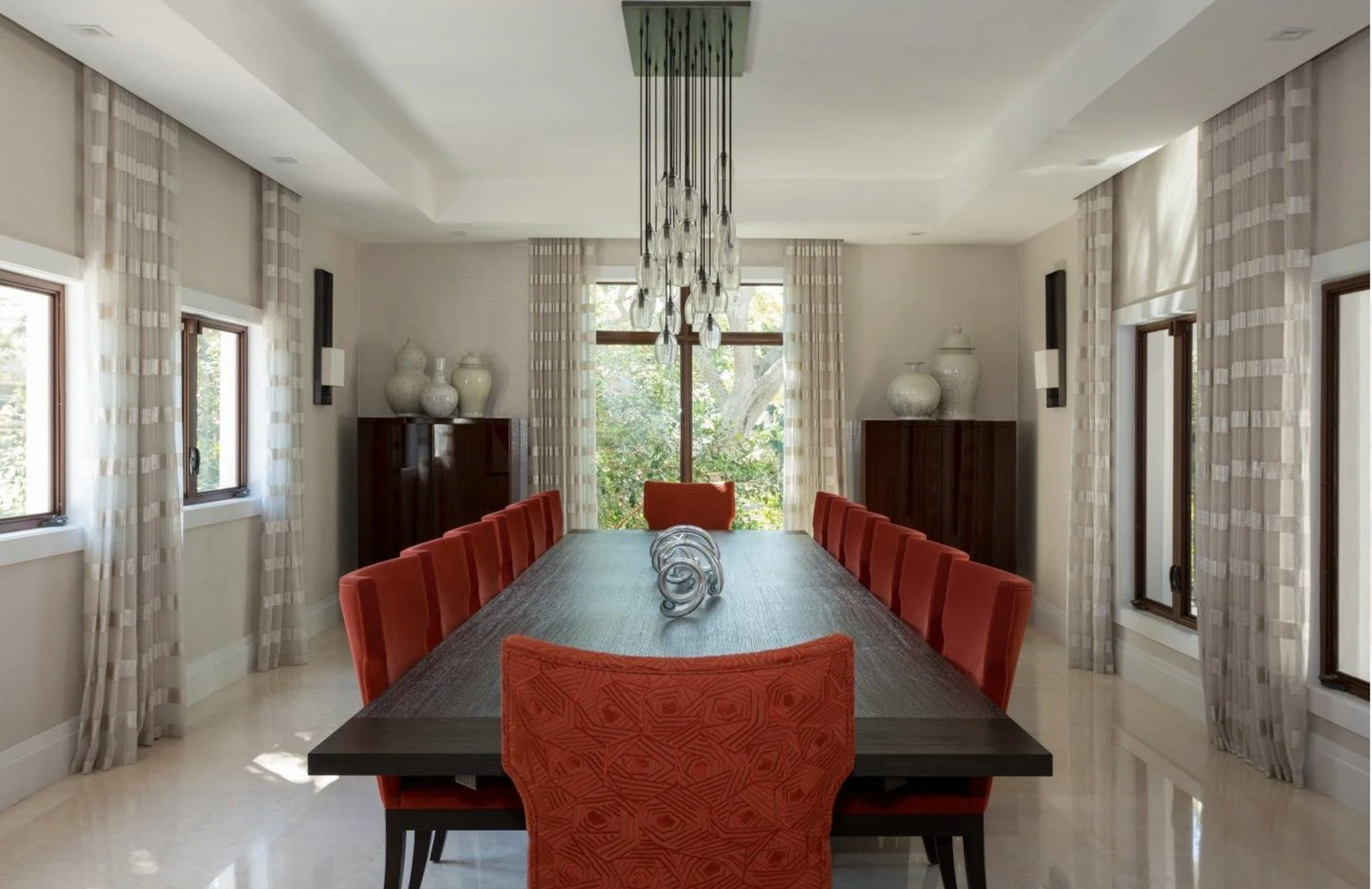 This residence is defined by a refined, conservative palette elevated through texture, proportion, and materiality. Natural wallcoverings, tailored window treatments, and layered upholstery introduce quiet depth while allowing architecture and light to take center stage.Living and dining spaces feature soft woven surfaces and custom sheers that gently filter daylight, balancing openness with intimacy. The result is a composed, timeless interior where craftsmanship and material selection create an understated yet richly detailed living experience