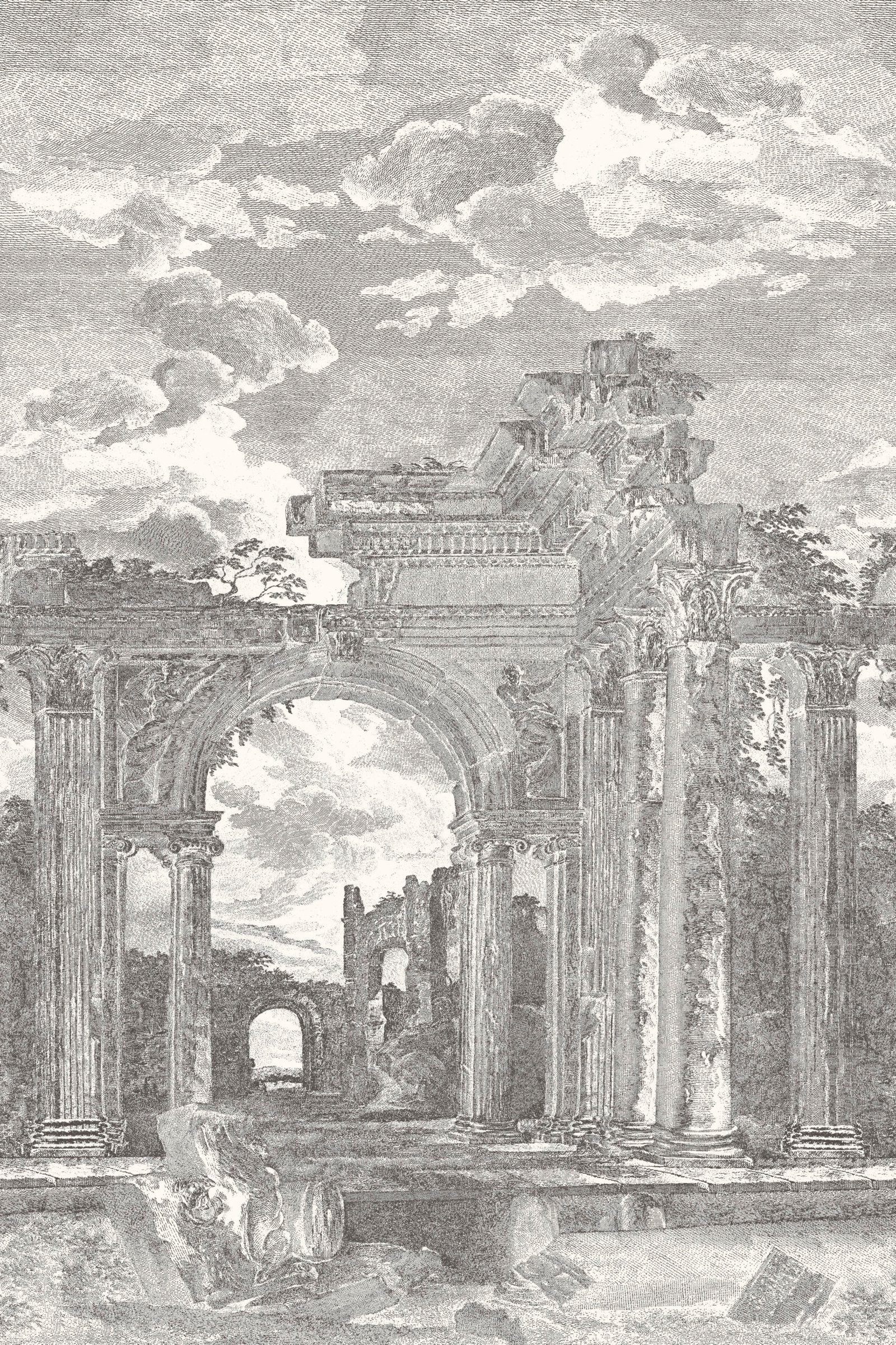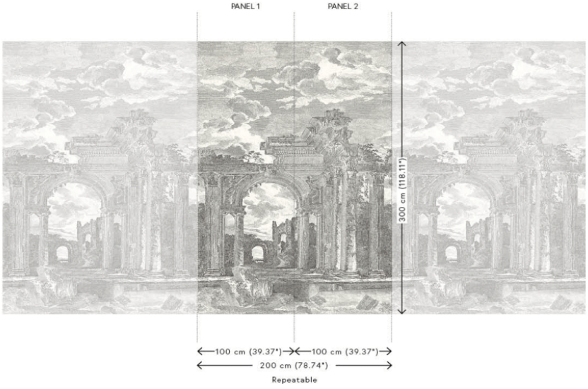 A panoramic mural inspired by classical engravings depicting ancient Greek ruins. Its architectural, timeless aesthetic adds depth, history, and sophistication, transforming the wall into a striking artistic focal point.